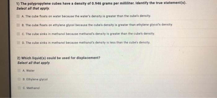 Solved 1 The Polypropylene Cubes Have A Density Of 0 946 Chegg Com